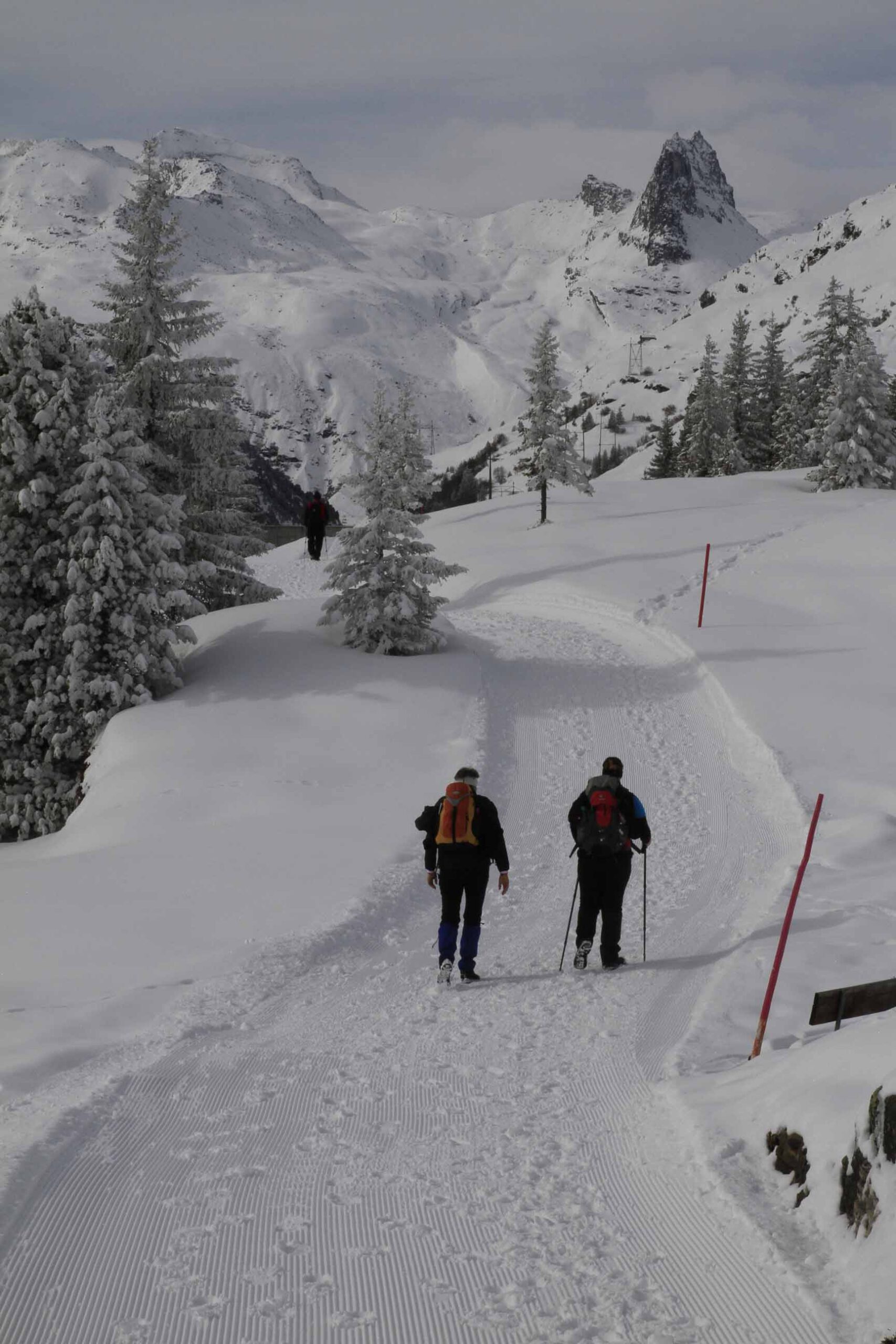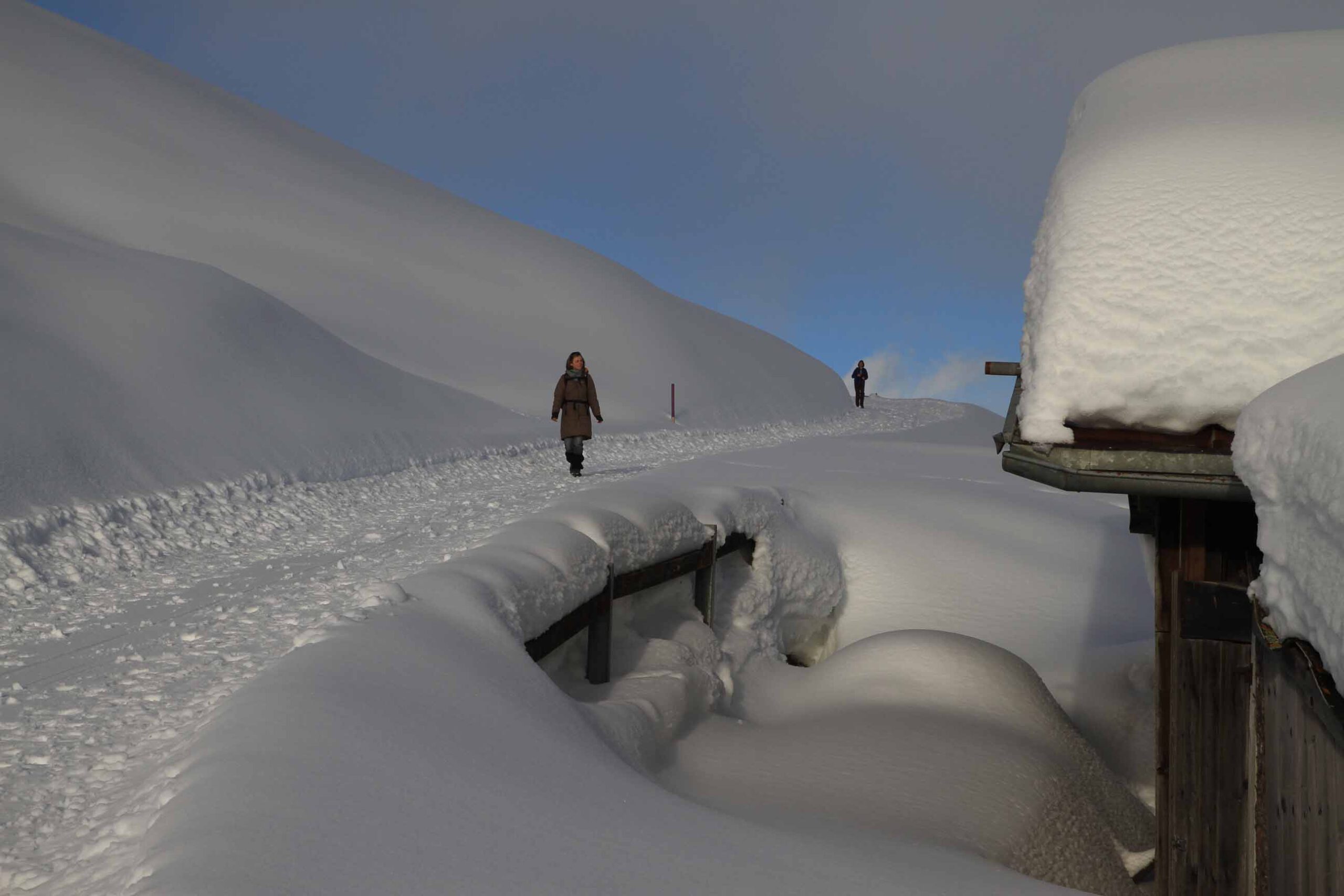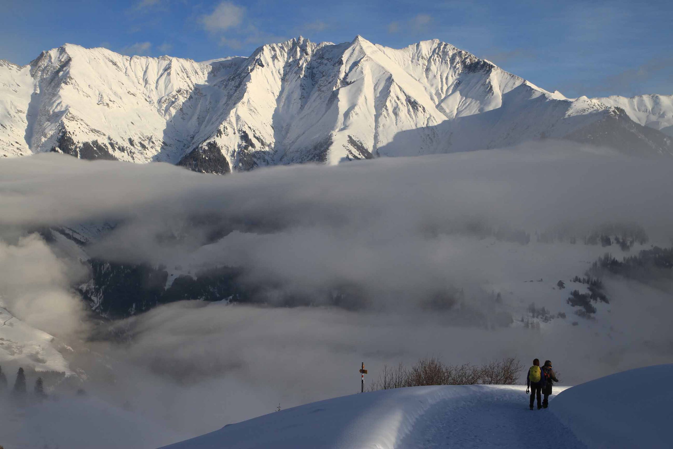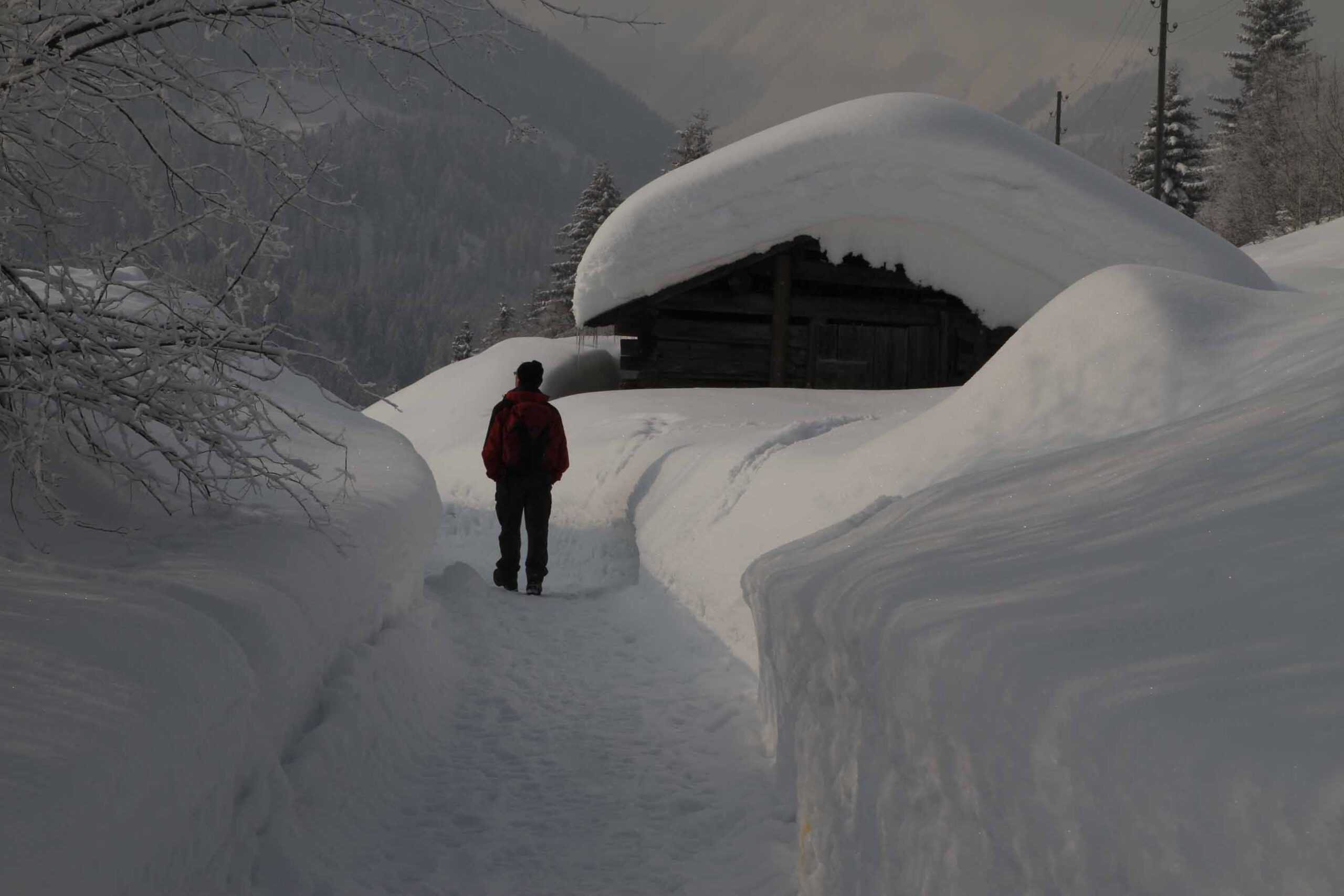 12 bis 18 km, tägliche Anstiege nicht über 300 Höhenmeter. Aber Achtung: Auch wenn die Wege bestens gespurt sind, kann das Wandern im Winter schon mal anstrengend werden – vor allem bei starker Sonneneinstrahlung, die die Oberflächen antauen lässt. Mit Spaziergängen haben die Etappen jedenfalls nichts zu tun! Die reinen Laufzeiten betragen 4 bis 6 Stunden. Man braucht eine gute Grundkondition und sollte nicht das allererste Mal im Gebirge wandern.
