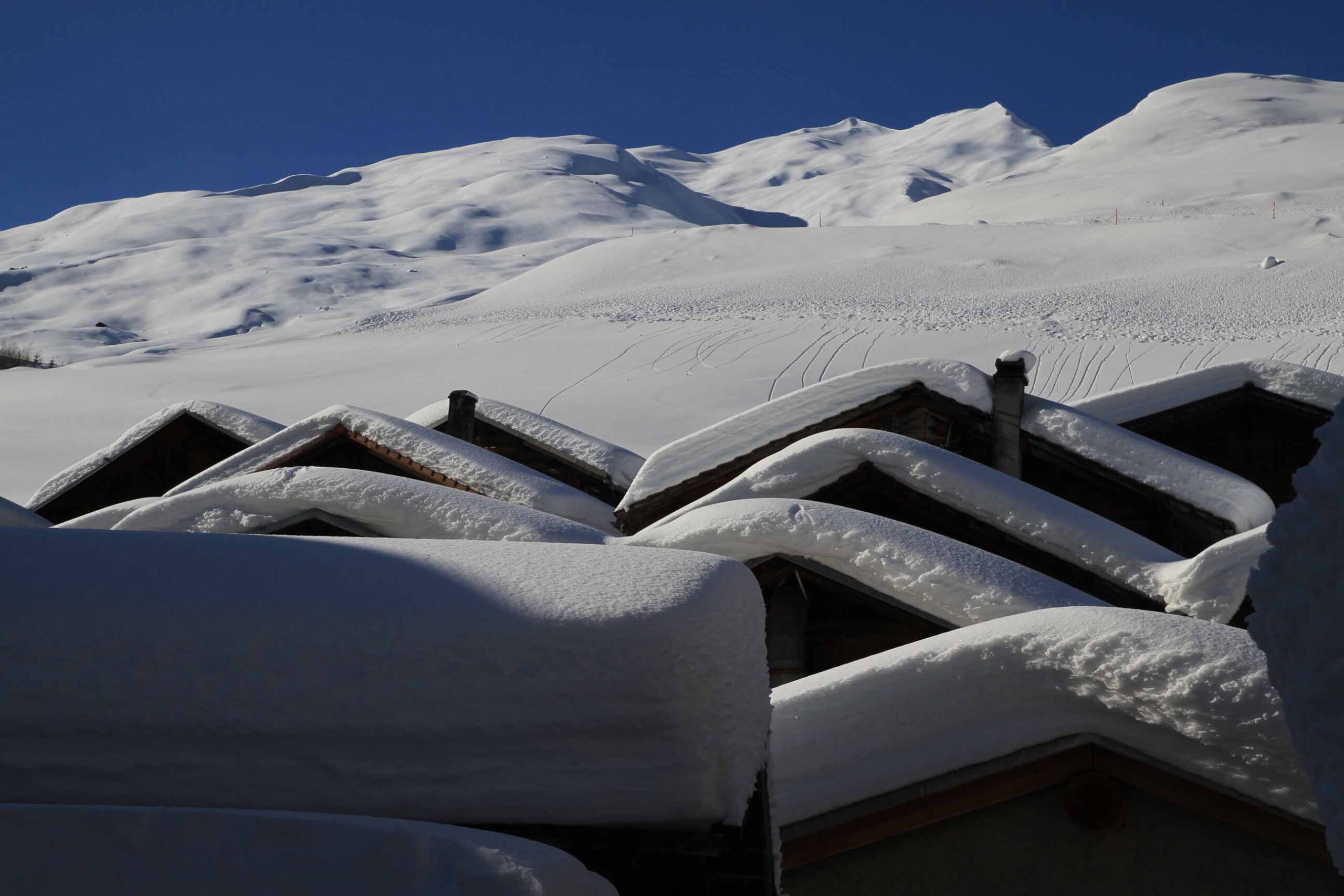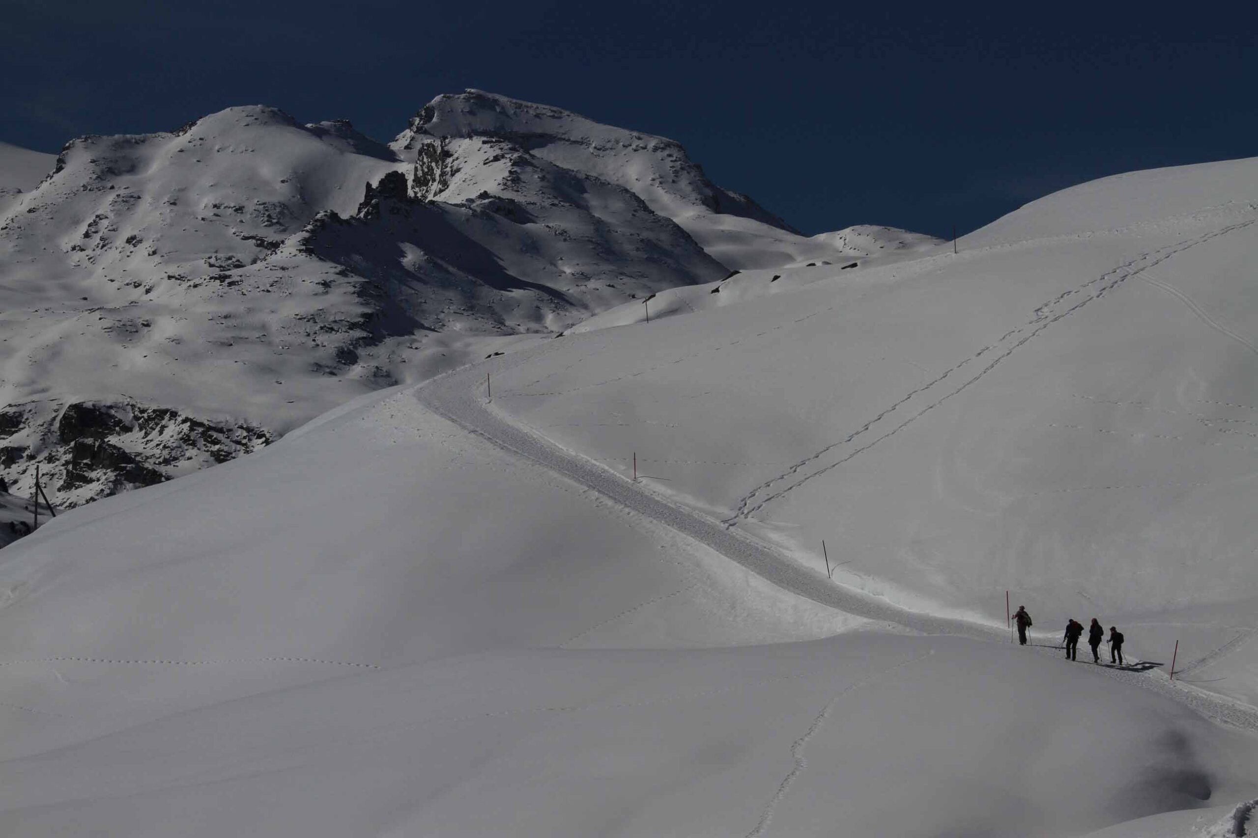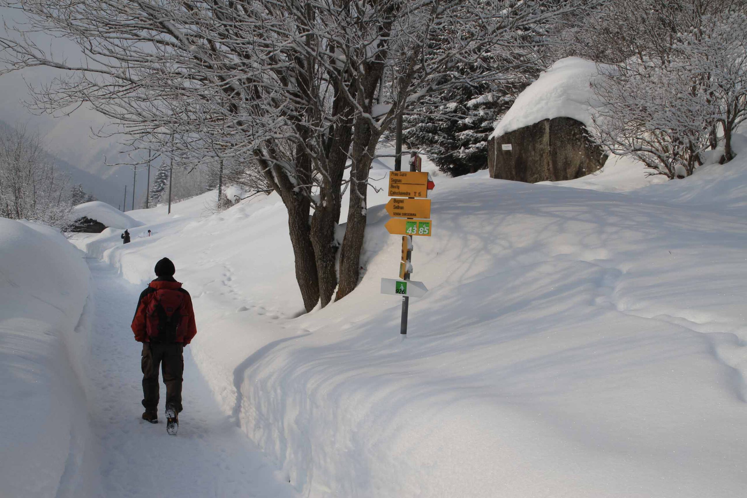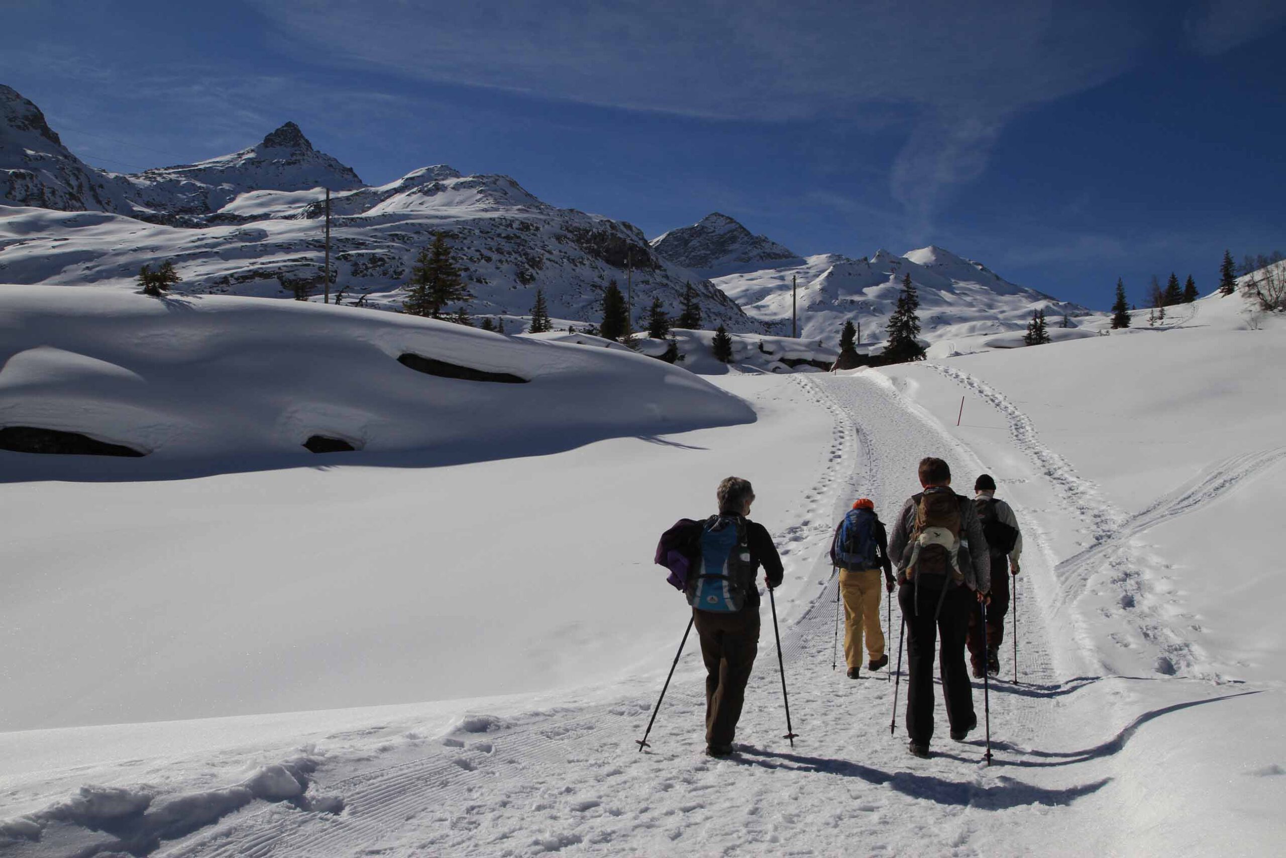 Das Besondere der Tour liegt darin, dass wir kein feststehendes Quartier haben, sondern von Ort zu Ort gehen, uns also wirklich auf den Weg machen – einen Weg, der uns mit der ganzen Region am Vorderrhein bekannt macht, statt nur mit einzelnen Ausschnitten davon. Wir sind also ganz wie im Sommer unterwegs, aber mit dem entscheidenden Unterschied, dass der Schnee unter unseren Sohlen knirscht und die in Weiß erstrahlende Alpenlandschaft geradezu verzaubert wirkt.