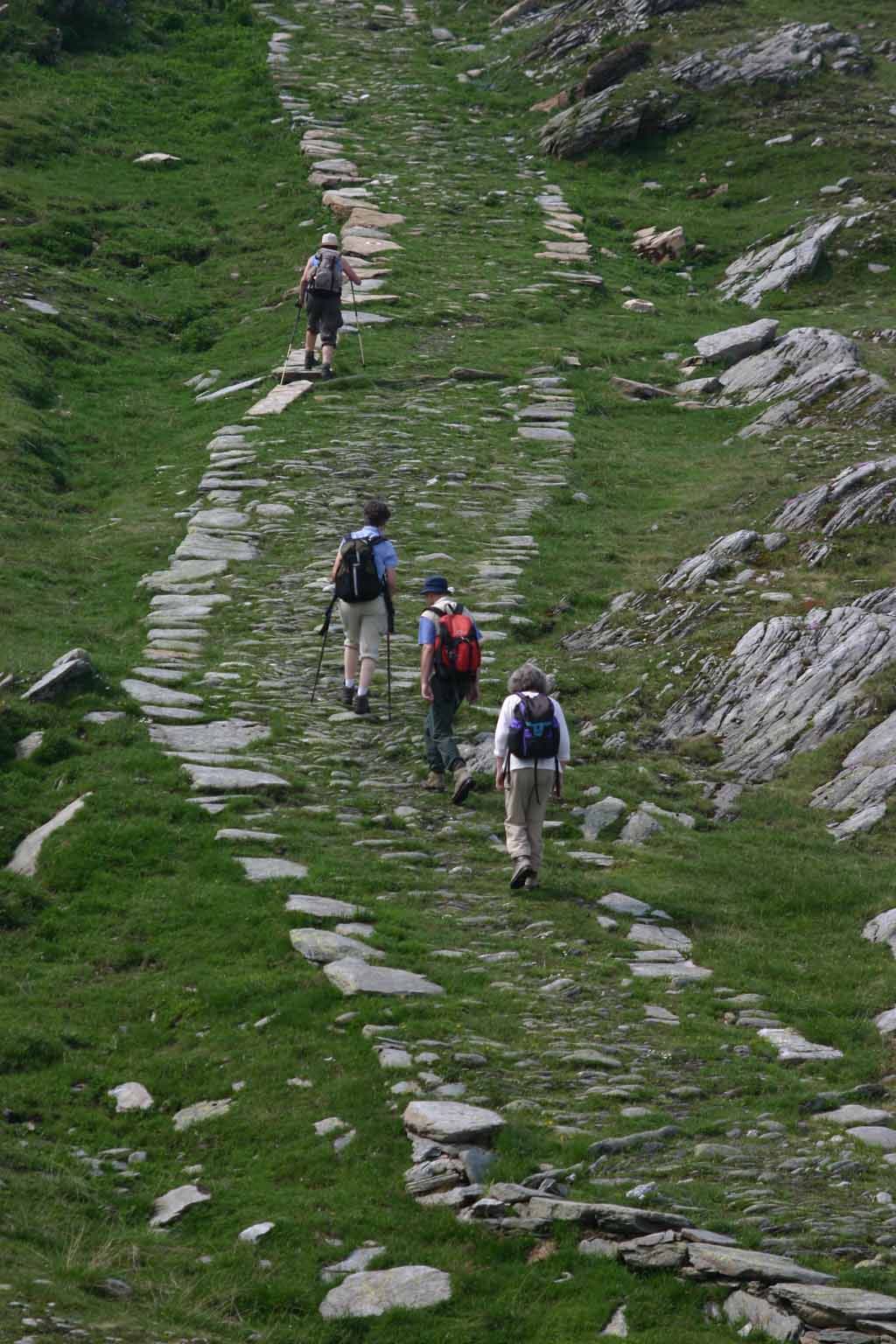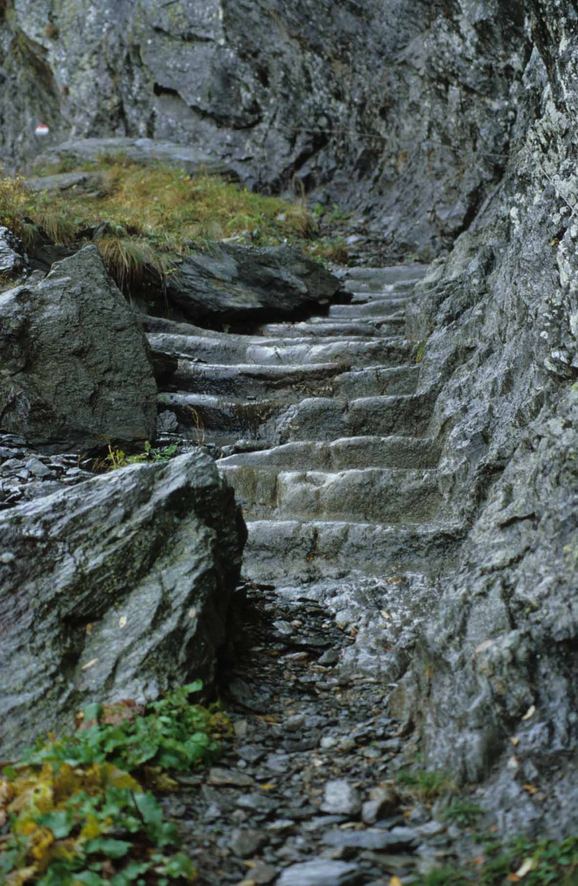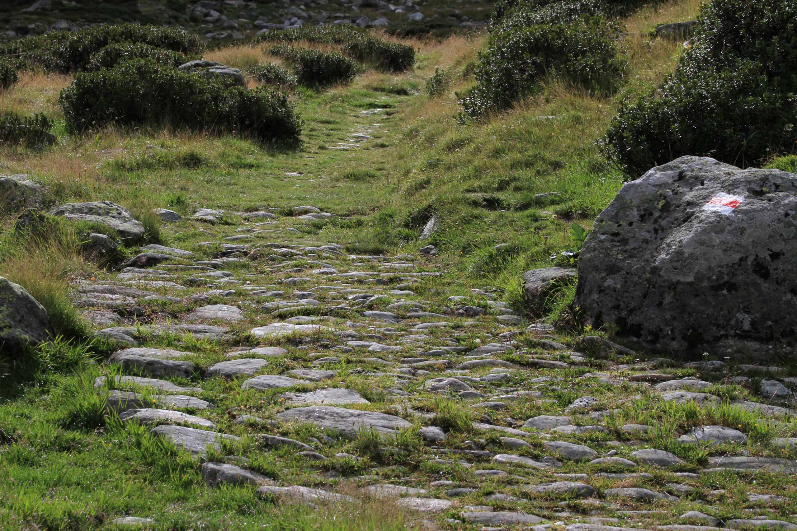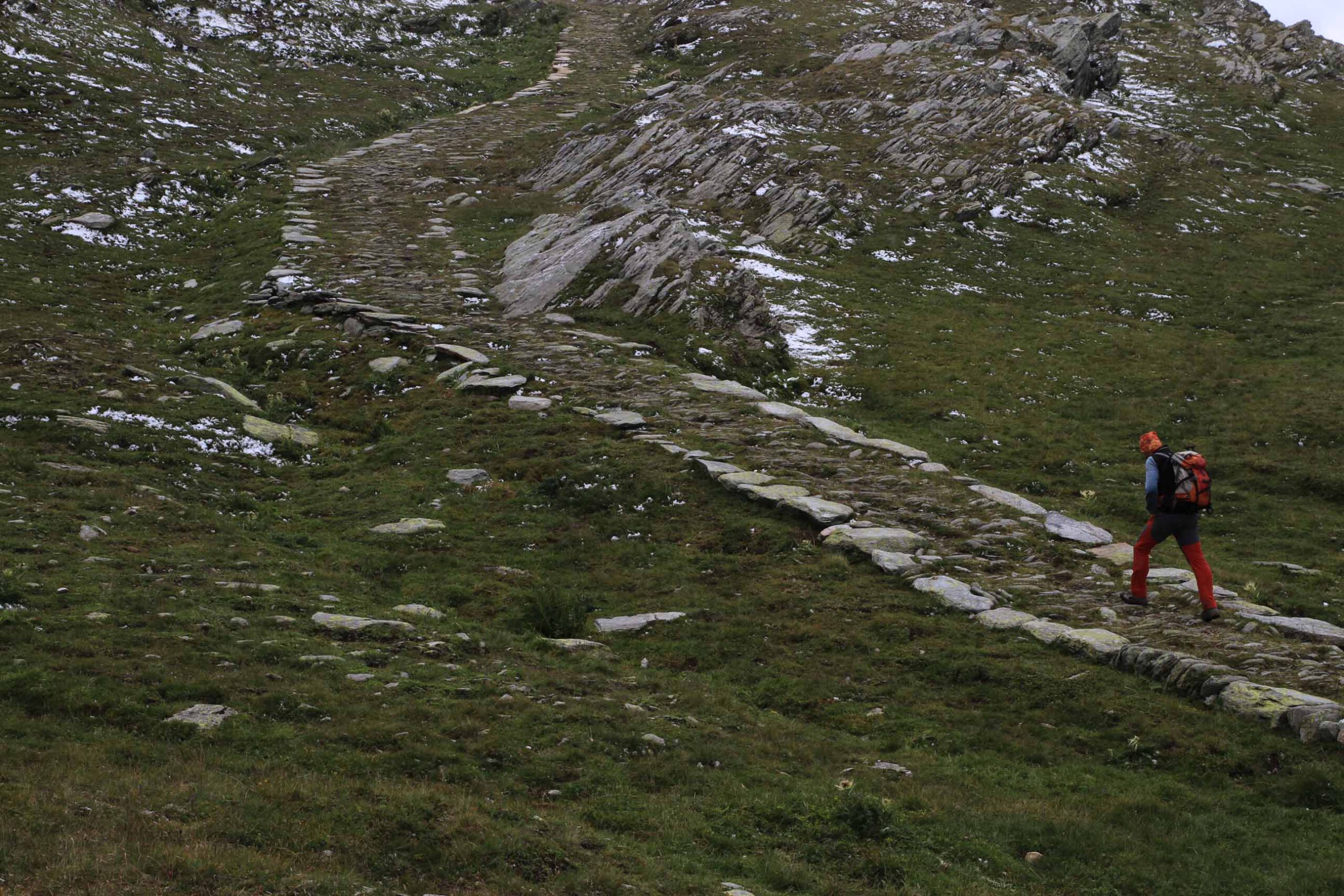 Der Saumweg über den Splügen-Pass wurde schon von den Römern benutzt und gehörte ab dem 15. Jahrhundert zu den wichtigsten Handelswegen über die Alpen. Auch nach dem Bau der kutschengängigen Kommerzialstraße im frühen 19. Jahrhundert wickelte sich hier ein großer Teil des alpenquerenden Transport- und Reiseverkehrs ab. Zum Glück ist die historische Säumerroute nur zum Teil überbaut worden, sodass wir immer wieder stundenlang über altes Pflaster wandern, was uns mit Haut und Haaren in eine spannende Passgeschichte eintauchen lässt.