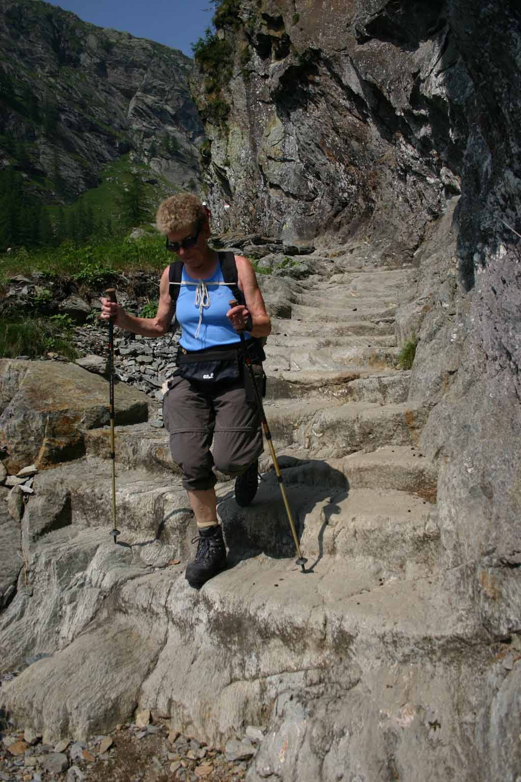 15 bis 20 km, in den ersten beiden Tagen steigen wir bei nur kleineren Zwischenabstiegen von 700 auf insgesamt 2100 Meter Höhe auf, kein Hexenwerk also, dennoch empfiehlt sich, einen Tag früher zur Akklimatisation anzureisen – das Posthotel in Sils (bei Thusis) ist für Schweizer Verhältnisse äußerst günstig! In der zweiten Wochenhälfte geht es dann weitestgehend bergab oder ohne große Höhenunterschiede am Fluss entlang. Die Herausforderungen sind mit einer durchschnittlichen Kondition gut zu meistern. Die reinen Laufzeiten betragen 4,5 bis 6,5 Stunden. Natürlich sollte man nicht das erste Mal im Gebirge wandern.